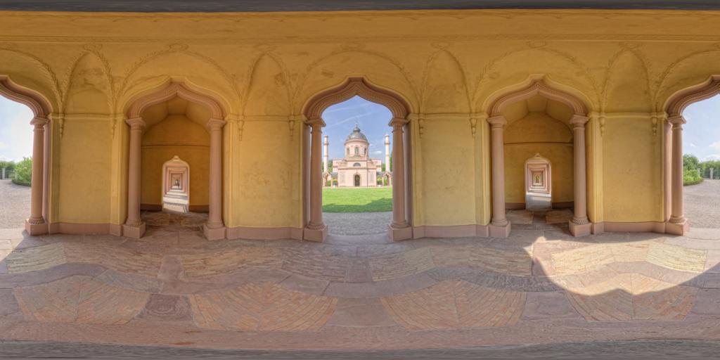 Das Bild zeigt die Rote Moschee im Schlosspark von Schwetzingen bei Kaiserwetter.