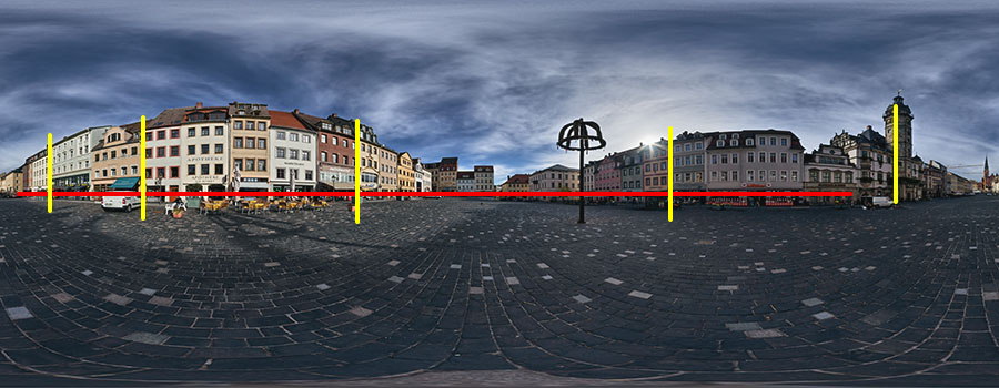 Hier noch Mal zwei Bilder zur Verdeutlichung. Im Equirect beschreibt eine waagrechte Linie in der Mitte den Horizont auf Stativhöhe.
