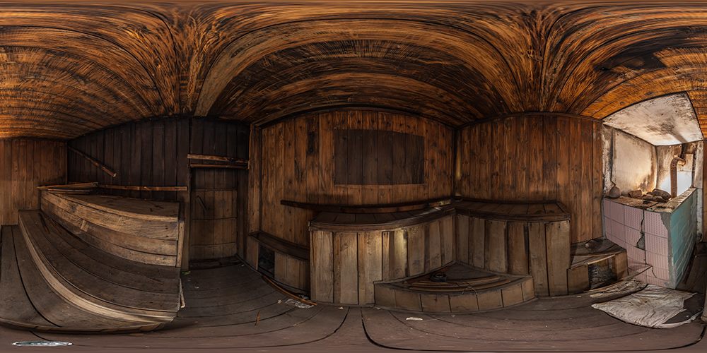 Am gleichen Tag habe ich auf dem Gelände u.a. noch ein Panorama in einer alten Sauna gemacht. Hier hatte ich mit der Enge des Raumes zu kämpfen, das Nadirfoto war dann eher ein "Krampf" und ich habe es etwas hinschummeln müssen