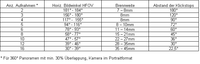 Wenn die Kamera mit dem Walimex hochkant montiert ist, bedarf es mindestens 4 Aufnahmen, also Klickstopp bei 0°, 90°, 180°, 270° und jeweils eine Aufnahme, damit ist der horizontale Bereich abgedeckt.