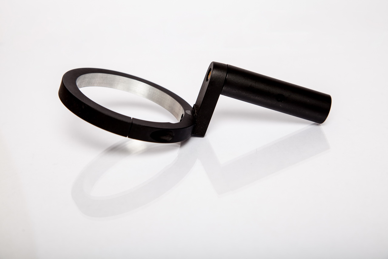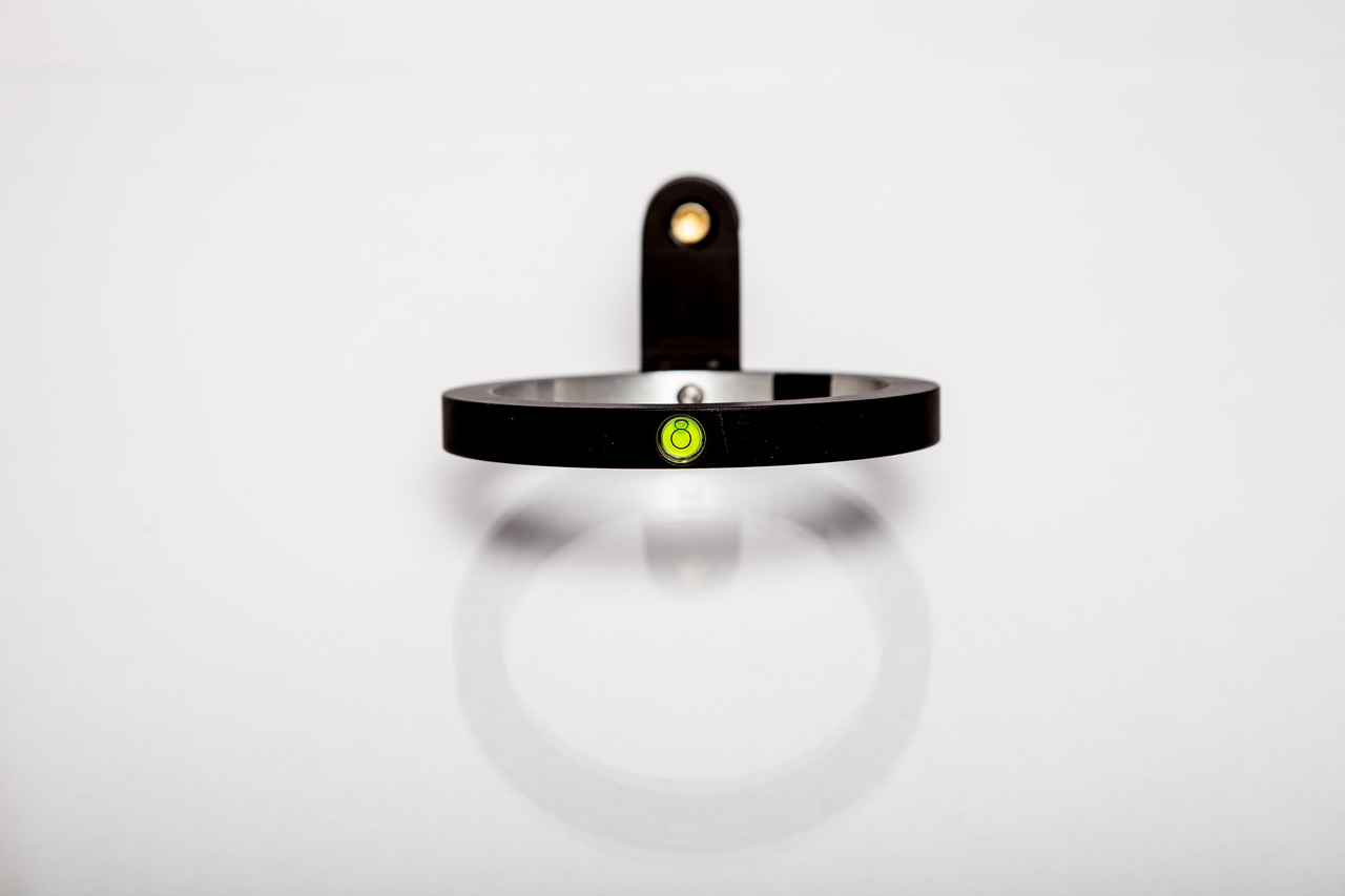 Oben im Ring ist eine kleine Dosenlibelle zur leichten Ausrichtung eingelassen. Der aus Aluminium gefräste Ring ist wie auch die zylindrische Verlängerung, eloxiert.