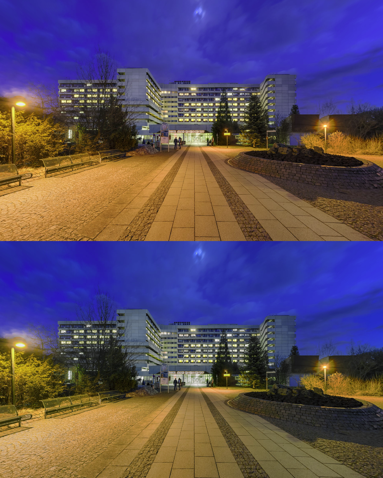 Das war mein größtes Problemkind. Zum Einen haben sich die Zweige bewegt und mir dadurch das HDR schon "zermatscht" (wurde mit Anti-Ghosting auch nicht besser), zum Anderen verläuft genau da der Übergang zwischen oberer und unterer Reihe. In der unteren Reihe war der Himmel schon deutlich dunkler.