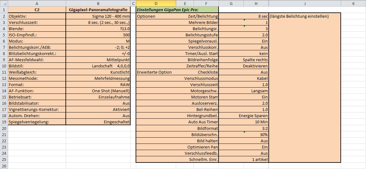 Ich hab da mal ne kleine Excel-Tabelle mit meinen Einstellungen die ich an meinem Gigapan und meiner 5D MkII zur HDR-Gigapanografie nutze...