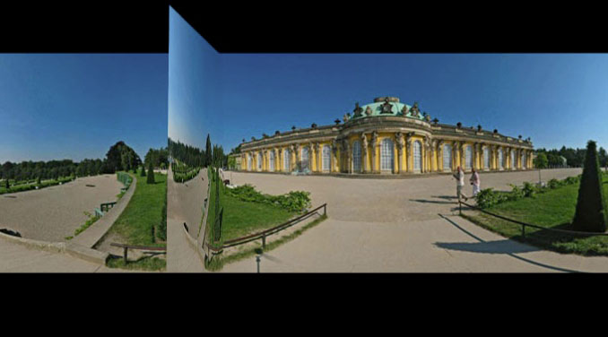 Volker Ich habe mal das Schloss Sanssouci-Panorama bearbeitet. Diesmal habe ich die seitlichen Ebenen nicht 90º