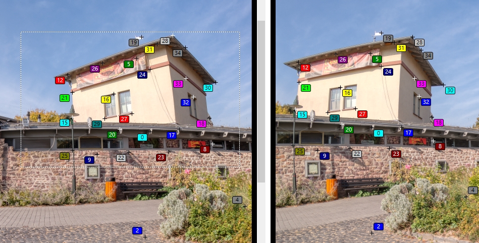 Eine Fehlerquelle kann immer die Wolkenbildung, Äste und Blattwerk sein. Je nach Windstärke zog die Wolke ein Stück weit weiter und/oder das Blatt bewegte sich. Ich würde Punkt 19, 4 und 5 also löschen. Punkt 2 ebenfalls. So dicht am Rand liegend, könnte er zu einer Verzerrung führen.
