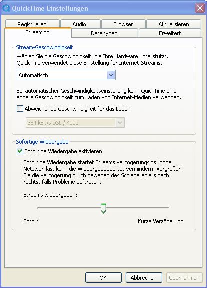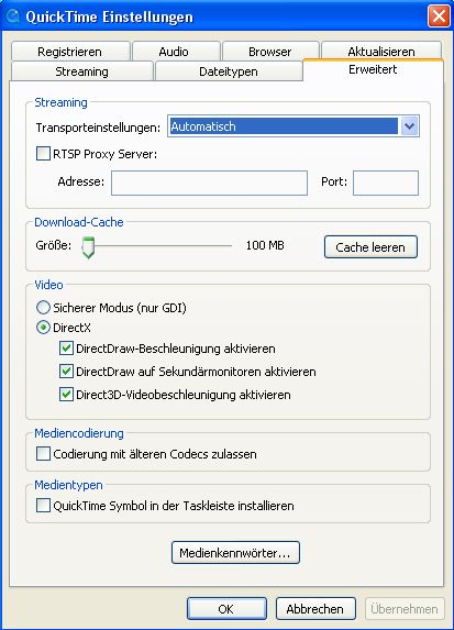 jetzt habe ich Quicktime installiert, dem FF gesagt, dass er das auch benutzen soll, aber noch keinen Erfolg gesehen. Dann habe ich den PC neu gestartet und es nochmal probiert, ich sehe immer noch keine Spur von einem Fenster für das Panorama, jetzt ist nichtmal mehr das schwarze Fenster da.Den VLC-Player nutze ich, um Videos zu schauen. Ich weiß nicht, ob damit interaktive mov funktionieren. Ich habe gelesen, dass das nur der QT-Player kann, den habe ich installiert, und brauchte nichts anderes mehr zu probieren.