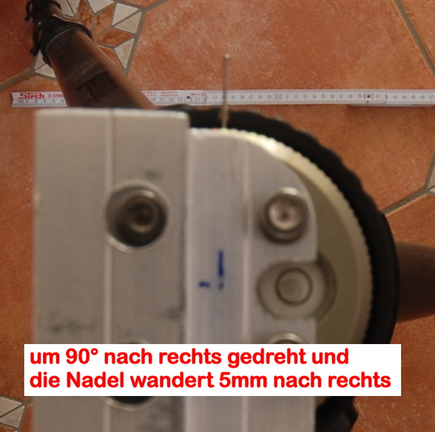 Da mir bei der Linealmethode aufgefallen ist, dass bei einem 90° Schwenk bereits die Markierung sich wegbewegt, habe ich eine Position gesucht, wo die Markierung auf dem Lineal in allen Stellungen stehen bleibt und nicht mehr eiert.