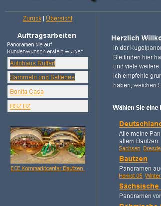 Richtig. Die aktiven Thumbs lassen sich leider nicht verlinken, nur das Bild wird ausgetauscht. (Javascript-Scheiß). Das ist bei nur einem Panorama in einer Region natürlich ungünstig. Du kannst z.B. Modul 13 statt Modul 43 nehmen. Dann gibt es wieder feste Thumbs mit Link. Auch möglich ist die Auftrennung Panoramaliste und Thumb durch Verwendung von Modul 41 (nur Thumb) und 42 (nur Liste). Dann kannst Du den Thumb irgendwo im Kopf unterbringen. Ich könnte wahrscheinlich recht leicht eine Abfrage der Menge von Panoramas in einer Region einbauen, vom User zu verändern, z.B. unter 5 Panoramen: Linkliste mit festen Link-Thumbs ab 6 Panoramen: Linkliste mit aktiven THumbs ohne Link Wenn die User es aber erst einmal verstanden haben, das die Bilder nicht aktiv sind, versuchen sie vielleicht nicht mehr, auf das Bild zu klicken.