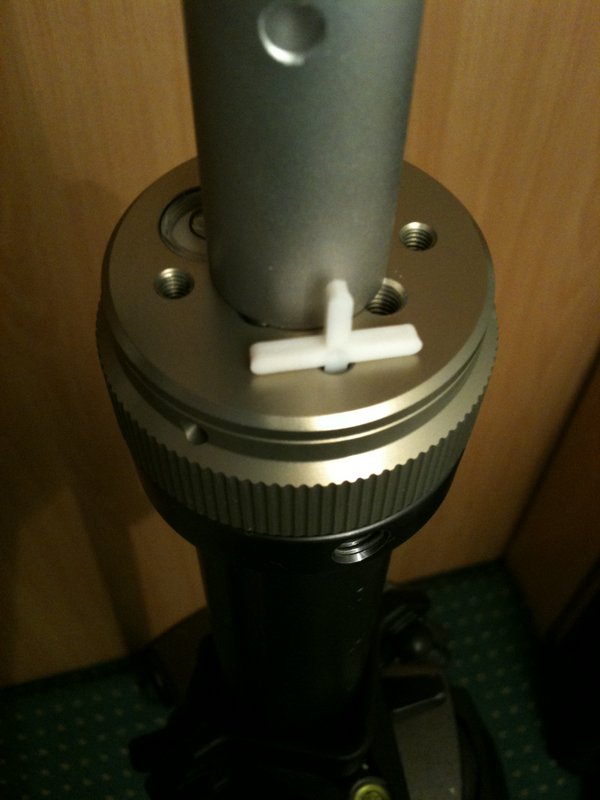 einer Rastung einen kleinen Stift (mitgeliefert) dort einführen und somit den Rotor blockieren. Der mitgelieferte Stift würde allerdings bei einem Bodenbild, falls dieser über Kopf steht, herausfallen. Für`s erste habe ich mir mit einem Fliesenkreuz beholfen. Das paßt knasch in die Öffnung und fällt auch über Kopf nicht heraus. Bei Nichtbenutzung stecke ich das Fliesenkreuz einfach in eine der oberen Innengewinde und habe es immer griffbereit. Auch dort fällt es nicht heraus. Ist das erste, was mir so eingefallen ist, wird evtl. später mal gegen eine andere Idee ersetzt.