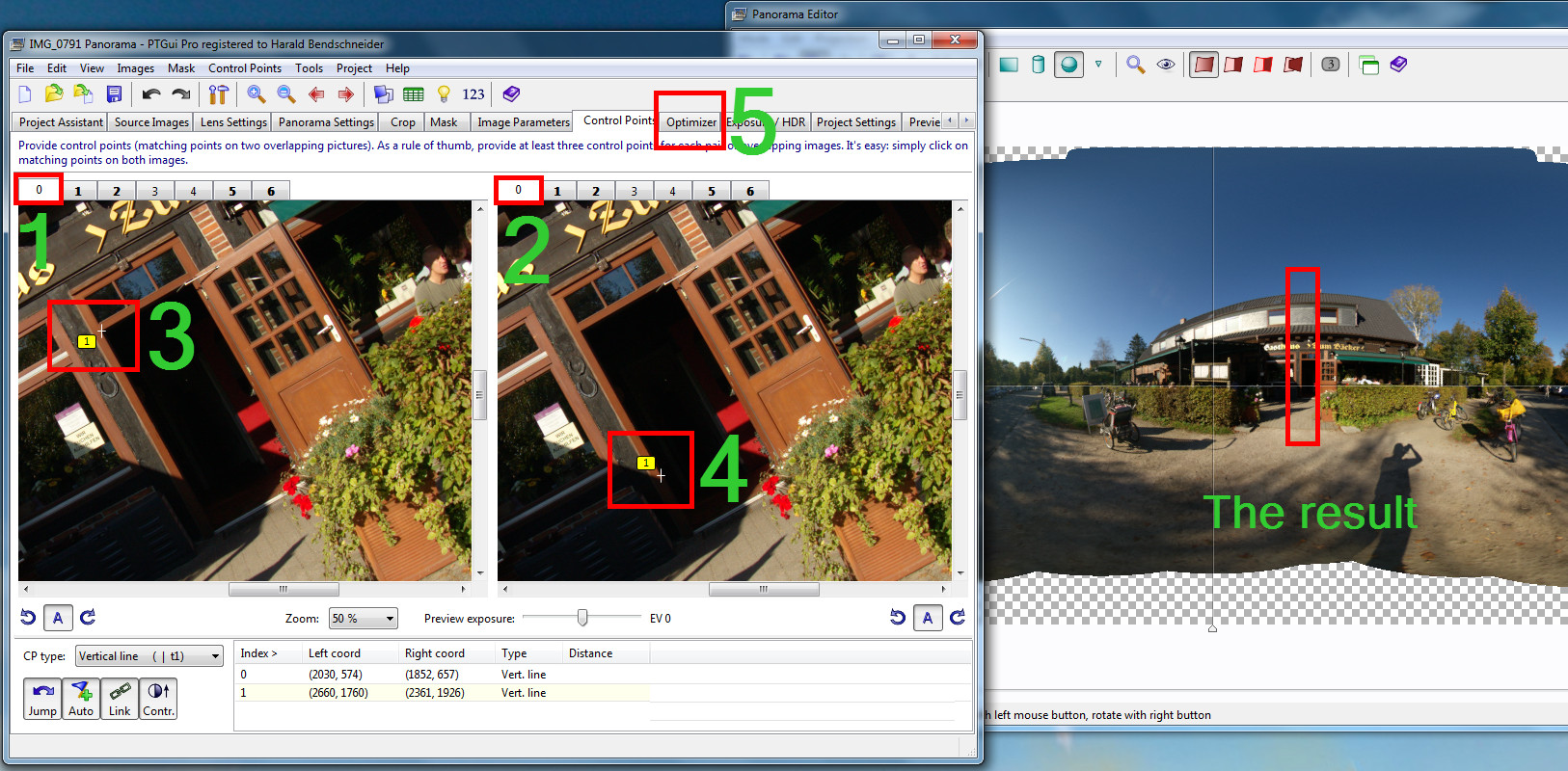 das geht, wenn Du im Kontrollpunkteditor in beiden Fenstern links und rechts jeweils dasselbe Fotos auswählst. Dann ist automatisch "vertical line" als Art des Kontrollpunktes voreingestellt. Dann setzt Du im linken Fenster den ersten Klick beim Anfang der vertikalen Linie und im rechten Fenster den zweiten Klick beim Ende der Linie.