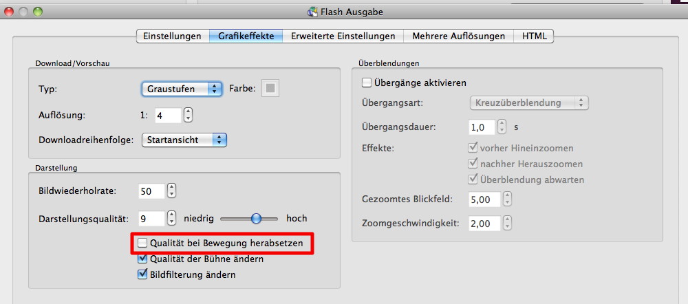 Für die Darstellung wähle ich folgende Optionen für die Flashdatei: