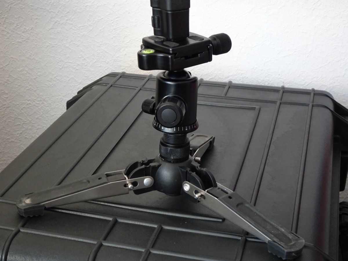 Über den (jetzt nicht mehr) aufgesetzten Kugelkopf. Ich möchte aber an der Stativbasis (zwischen Standspinne und Rohr) eine Nivelliermöglichkeit haben*