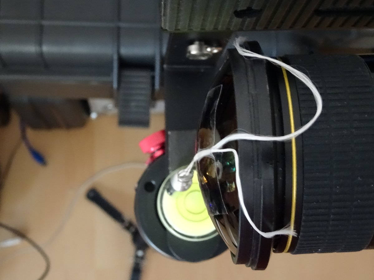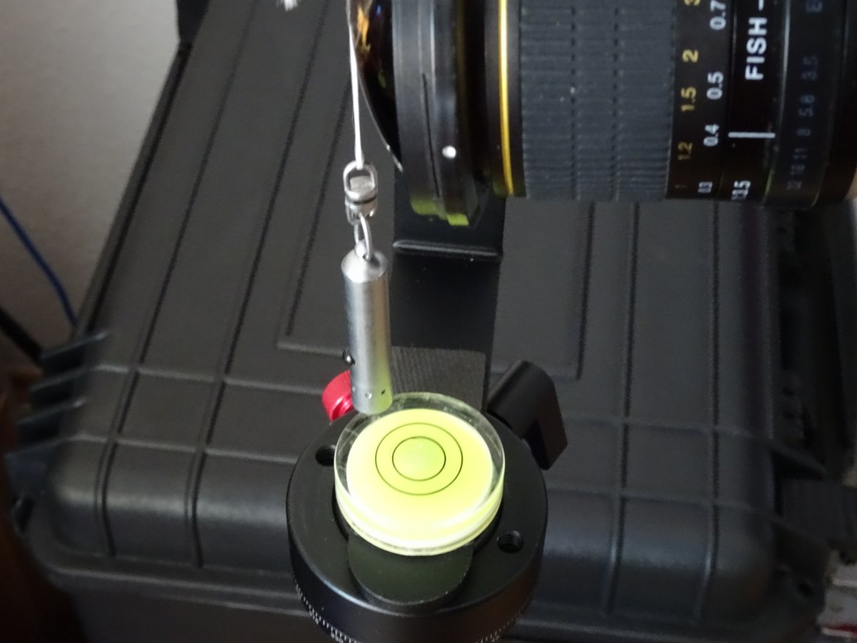 Die Frage hatte ich schon beantwortete. Es existieren 3 Bohrungen, wovon die Äußerste ziemlich genau passt. Wie genau, zeigen die eben auf die Schnelle gemachten Fotos. Ich kann mir nicht vorstellen, dass Jan mit seinem manuell festgehaltenen Monopod und der Dosenlibelle nicht mindestens so große Abweichungen hat wie meine paar Millimeter - oder? Das Lot zeigt, dass es etwas nach vorne hängt. Ich gehe aber davon aus, dass der Lichteintritt nicht direkt vorne am Glaskörper des Objektivs, sonder etwas weiter hinten sitzt. Deshalb hat mich das nicht groß beunruhigt.