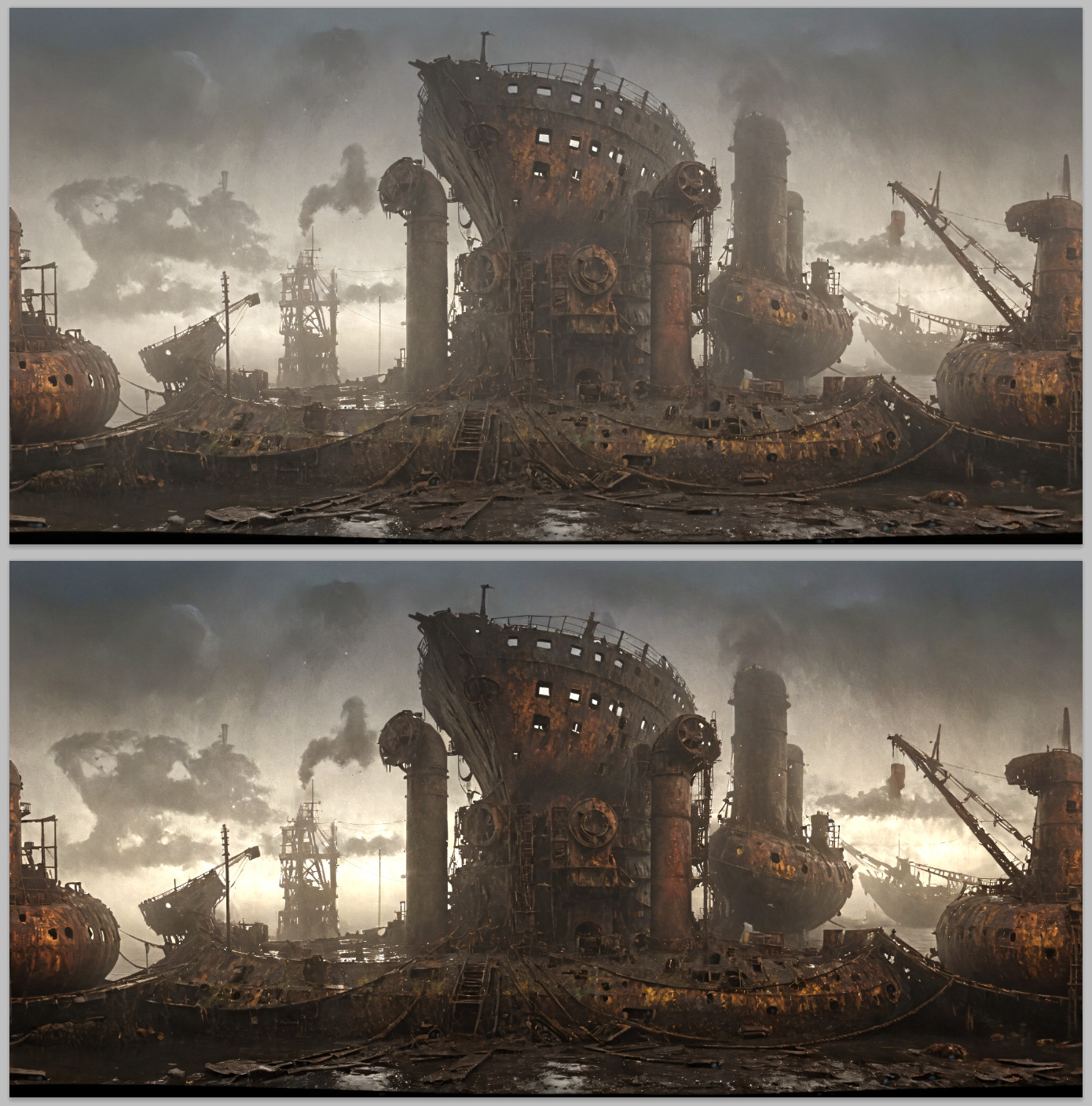 A dark and ancient hall with various huge, old and rusty machines, cables lying around, distribution boxes on the walls, broken window panes, moss and other vegetation hanging from the partly collapsed ceiling and walls, hazy and contrasting air, tons, crumbling boxes, broken pipes, fans on the ceiling, broken floor tiles, plants sprouting from the joints, oppressive, eerie, dilapidated, old, puddles of water on the floor, <lora:Into_Darkness:0.7> <lora:Cloudify-SDXL:1>