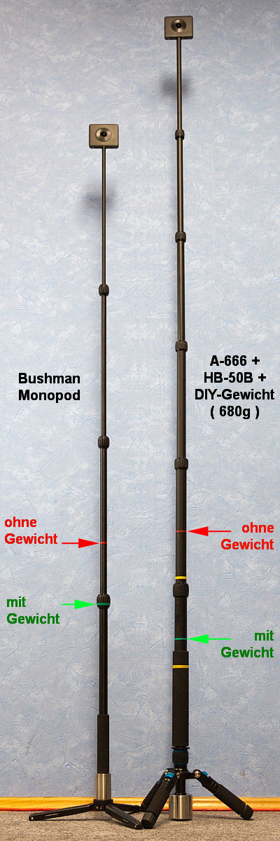 1.) Ohne Nivelliereinrichtung ist das A-666 auf H-50 mit meinem DIY-Gewicht der Sieger. Es würde erst ab einer Neigung von 10,7° im worst case und 20,6° im best case kippen. Dabei ist das Auge der Mijia in einer Höhe von 1,975m - 33cm über dem des Bushman!