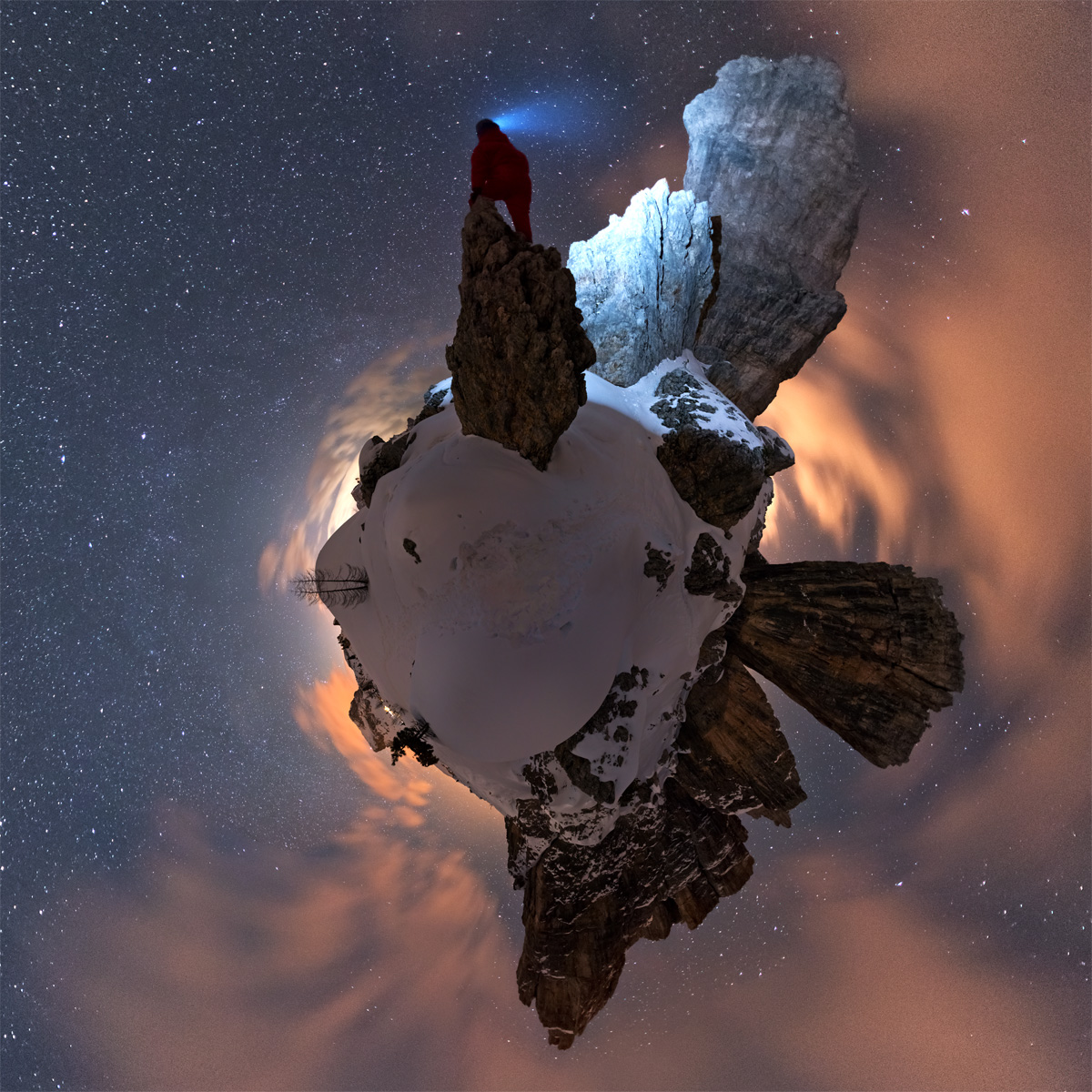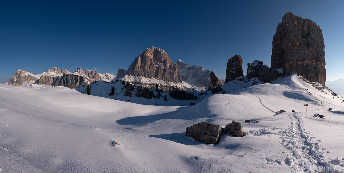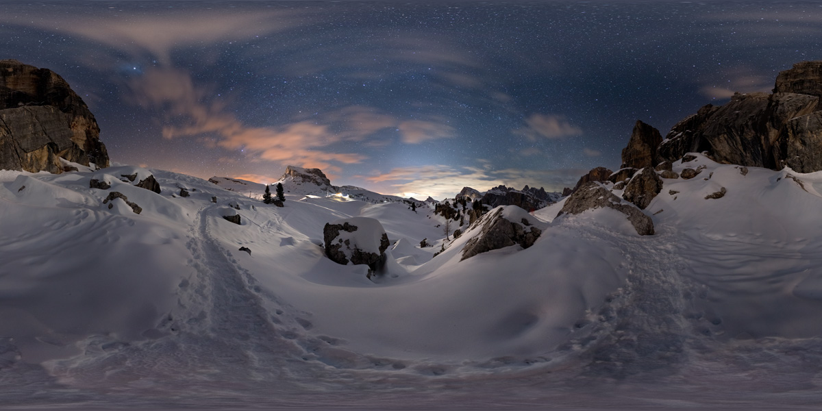 zu den Cinque Torri kommt man über Cortina d´Ambezzo und Richtung Falzaregopass - bei den Türmen gibt es ein Schigebiet und wir sind gemütlich mit dem Sessellift rauf. In der Hütte haben wir uns bei Bier und Speck auf die Nacht eingestimmt. Gegen Abend haben wir unser Zelt aufgestellt und sind dann fast die ganze Nacht bei den Türmen unterwegs gewesen. Die Panos wie immer mit Nikon D800, Sigma 15mm, ISO 2000-3600, Blende 3,2 und 25 Sekunden Belichtungszeit. Es gibt auch Schneeschuhwanderwege - also kann man sehr gut rummaschieren.