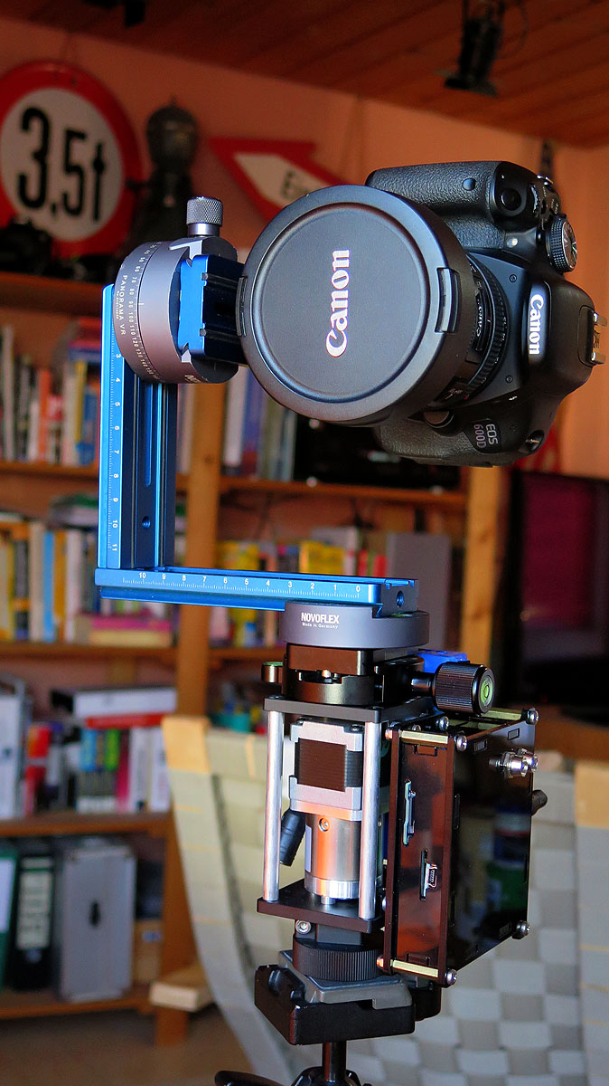 Den Novoflex Panoramaplatte hatte ich übrig und das Problem war auf die schnelle beseitigt. Ist aber alles trotzdem sehr stabil, hab gerade einen Funktionstest mit der Kamera und den Novoflex Slant gemacht. Die Funktion auch noch umprogrammiert das erst nach der Belichtung, wenn das Signal über den Blitzschuh kommt dann weitergedreht wird, funktioniert auch bei HDR prima!