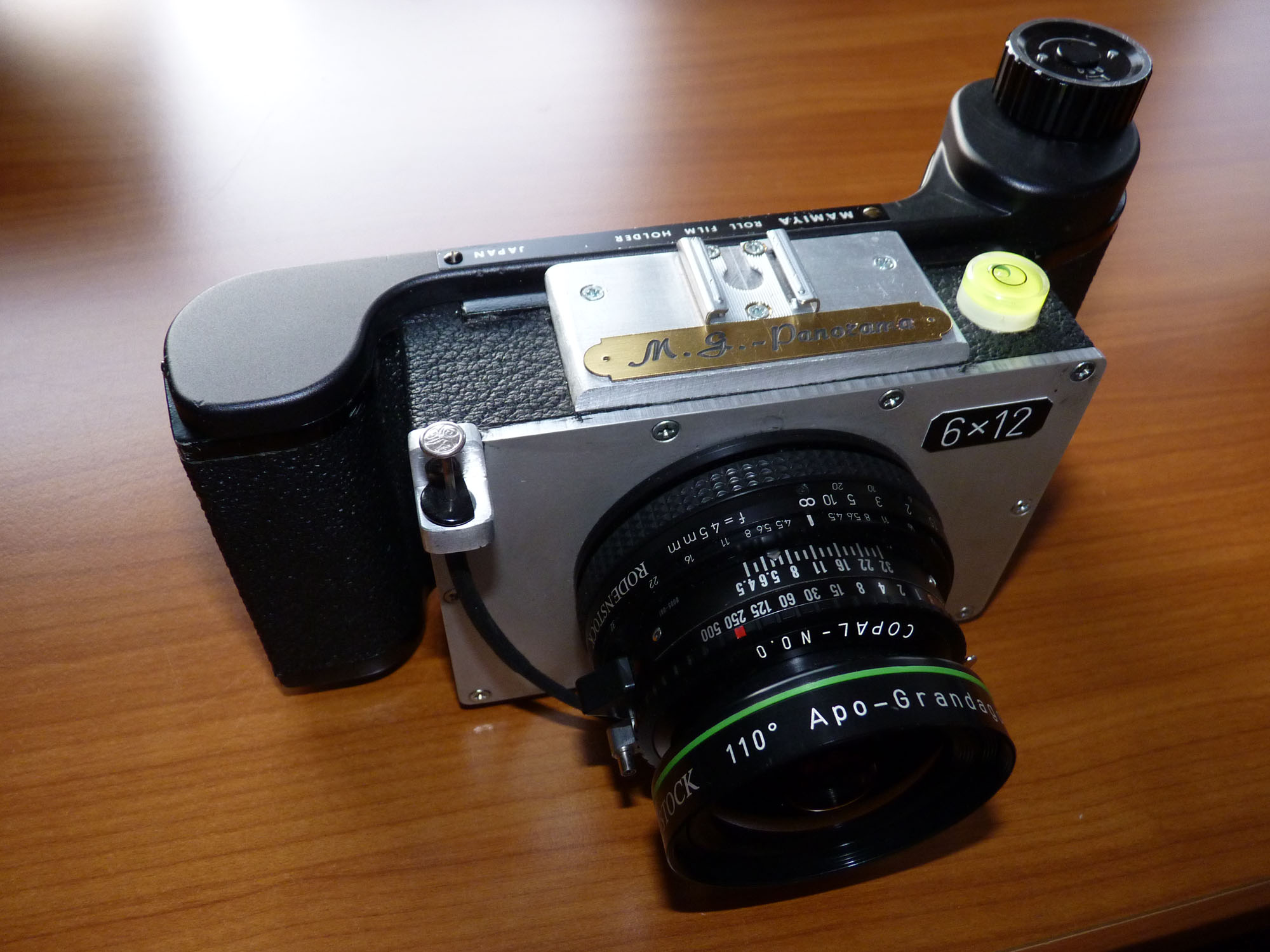 Ich biete hier eine 6x12 Panoramakamera im Mittelformat an. Originalkameras für dieses Format sind sehr teuer. Ich habe diese Kamera bei jemandem gekauft, der über die Jahre Kameras in Eigenbau hergestelt hat. Dieser Herr lebt leider nicht mehr. Ein Bericht über ihn aus der Zeitschrift "Photo Deal" aus dem Jahre 2003 habe ich angefügt, ebenso einige Fotos von der Kamera. Die Herstellung der Kameras dieses Herrn, der auf vielen Fotobörsen bekannt war, erfolgte größtenteils aus neuwertigen, gebrauchten Fotokomponenten. Teilweise auch Neuteile. Damit ist so eine Kamera auch für den ambitionierten Anwender relativ preiswert zu bekommen. Die Basis dieser 6x12-Kamera bildet ein Mamiya-Universal-Magazin. Die Optik ist ein Rodenstock Apo-Grandagon 4,5/45mm 110°. Der Verschluss ist ein Zentralverschluss Copal 0 von 1 - 1/500 und B. Sonstiges: Aufstecksucher, Filmtransport über Knopf und Filmfenster.
