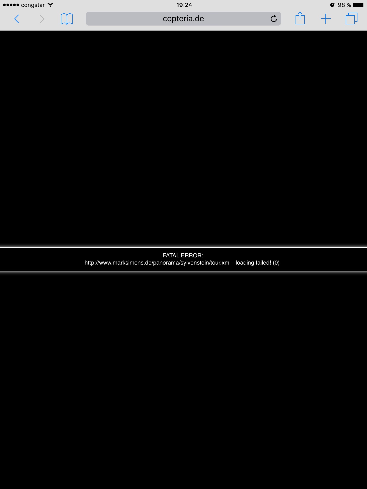 Bei Aufruf von http://copteria.de/001/index.html öffnet sich im Desktop-Browser sofort die Tour, und alles ist fein, aber auf dem iPad und dem iPhone kommt die Fehlermeldung: