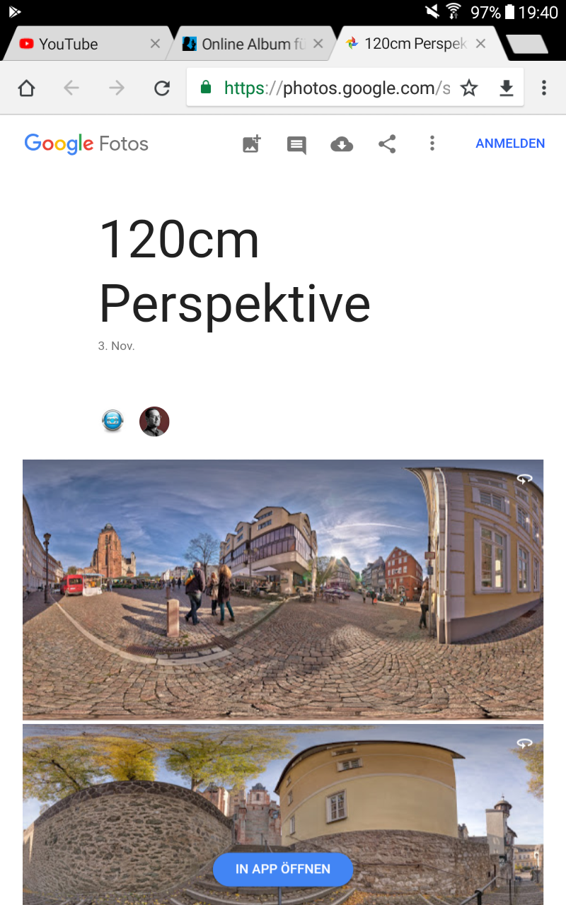 Getestet mit dem iphone = Der link funzt, doch der Ordner war leer und ich wurde aufgefordert, die Google-Foto-App zu installieren. Als ich das Fenster der App schloss (ohne Installation), tauchten die 3 Panoramen dann doch auf und ließen sich auch flüssig drehen.....