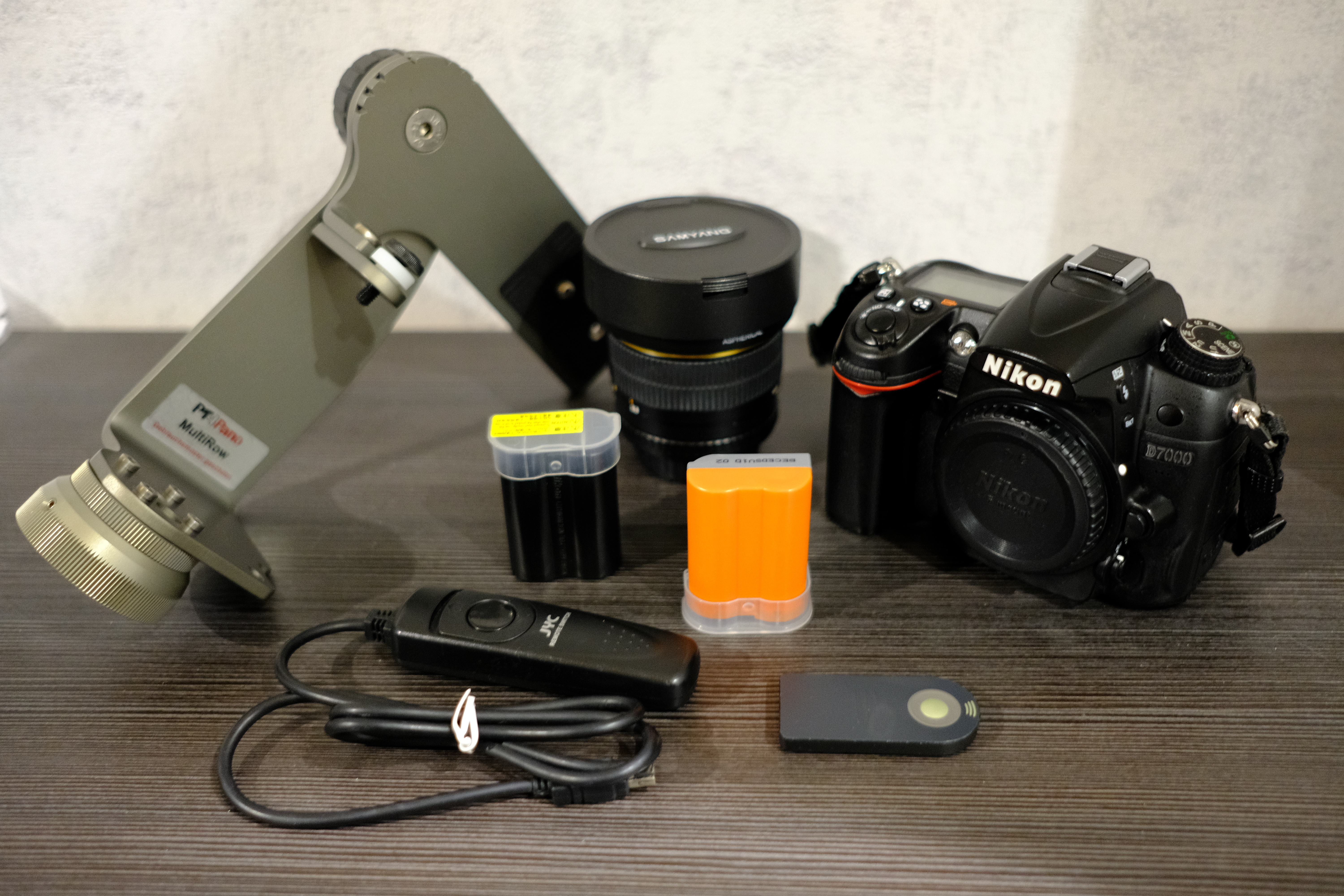 Nikon D7000, Samyang 8mm Fisheye f3,5 und den eigens dafür angefertigten Multi Row Adapter der Fa. PT4Pano,