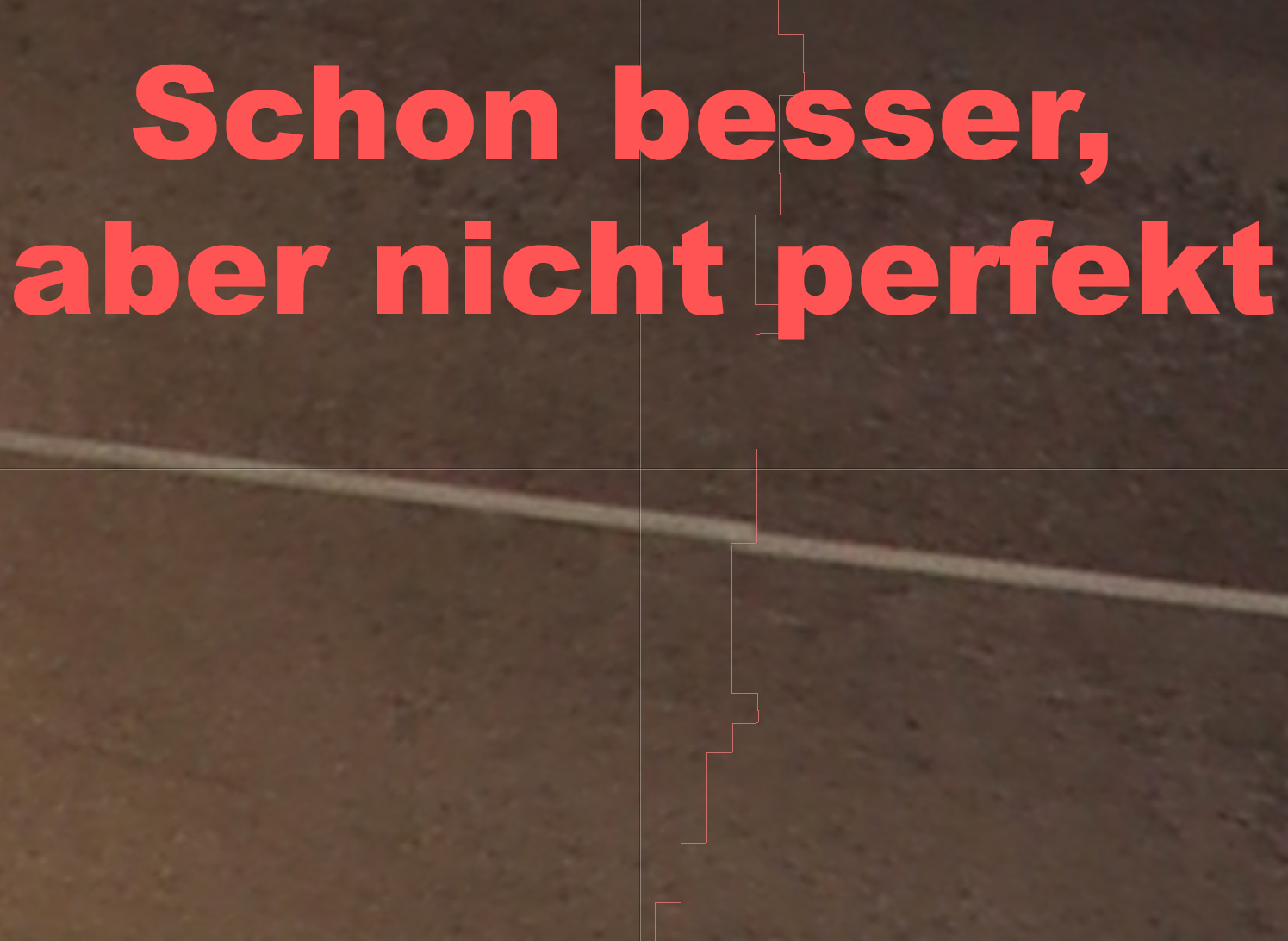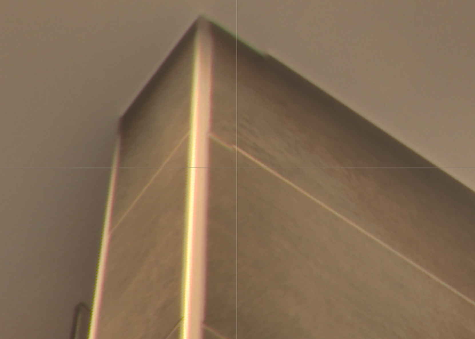 Nun habe ich von Foto 1 den sichtbaren Teil des Rahmens ausgeschnitten und auf einer neuen Ebene bunt übermalt. Diese neue, farbige Ebene nach Bild 2 dupliziert und im gleichen Bereich Positioniert. Hierh habe ich überprüft ob der ausgeschnittene Teil von Bild 1 in Bild 2 past. Nach 3 mal fotografieren war keine Verschiebung mehr zu erkennen. Vielleicht 1PX, aber nur wegen der "verschiedenen" Beugungen im zweiten Bild.