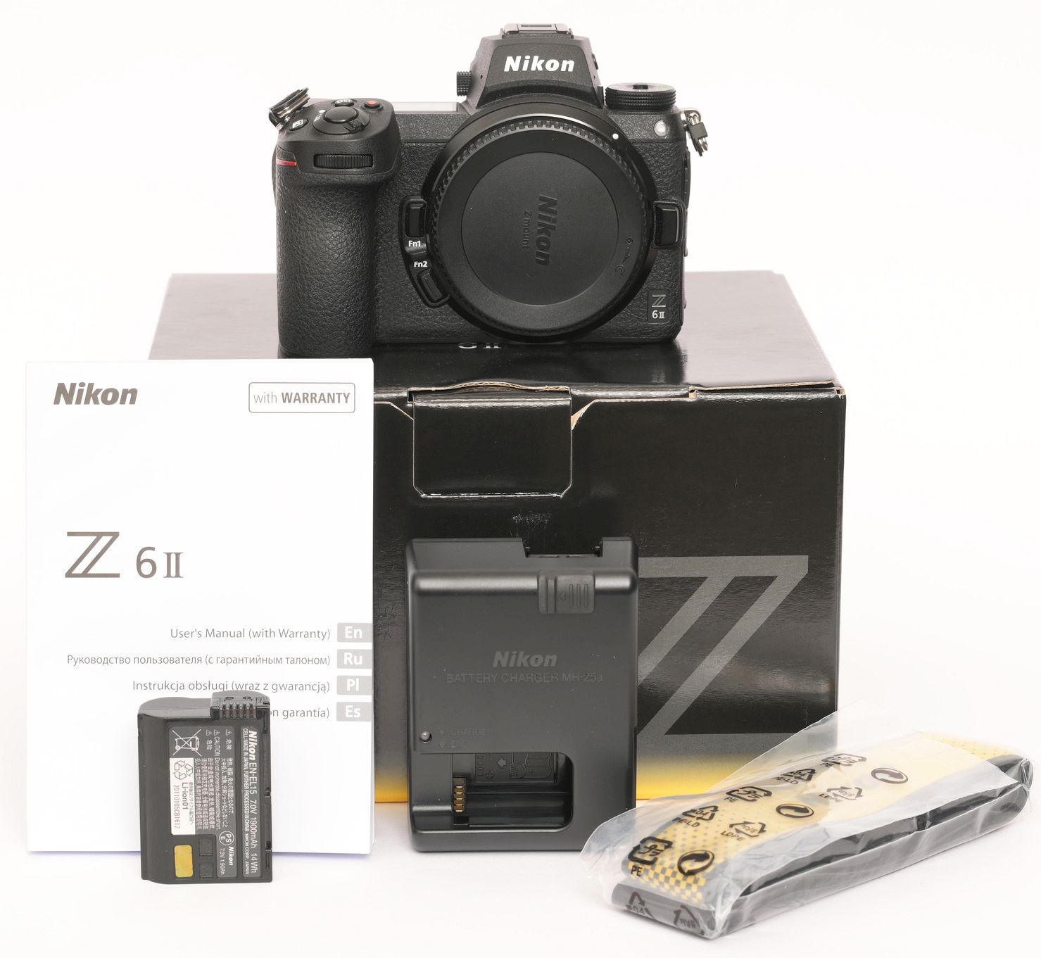 Lieferumfang wie auf den Fotos, Akku, Ladegerät, Tragegurt, Anleitung und Original-Karton.