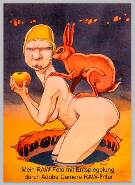 Die Lichtsituation war wieder einmal durch das grelle, tiefstehende Sonnenlicht schwierig. Ich finde, die XPhase hat die hohen Kontraste ganz gut gemeistert. Eine weitere Schwierigkeit bei solchen Ausstellungen sind immer die Lichtreflexionen in den Verglasungen einiger Bilder. Hier habe ich dann die Bilder der Panoramen durch Bilder ersetzt, die mir die Künstler zur Verfügung gestellt haben. Die Foto-Funktion von Pano2VR, bei der die Bilder herausklappen, hat mir nicht immer gefallen. Im zweiten Panorama erscheinen mir aber die ins Panorama eingepatchten Künstler-Bilder teilweise zu stark herauszustechen. Bei zwei Bildern habe ich die Dynamik schon verringert. Interessant fand ich meinen Versuch, mit der neuen Spiegelungsentfernung von Adobe Camera RAW die Spiegelungen zu entfernen.