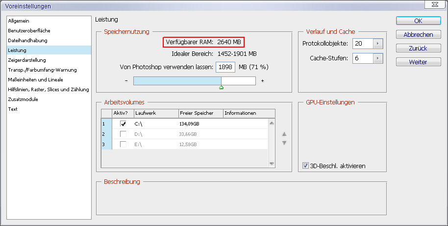 ich sollte ergänzen, daß ich neulich meine 2GB RAM auf 3GB hochgerüstet habe. Über die Suche fand ich nen Thread, in dem ein Speicherproblem zu Trouble beim Zurückverwandeln führte. Hab zuvor nicht nachgeschaut, wieviel RAM dem Photohop zur Verfügung stand. Die aktuelle Situation im Bild im Anhang.