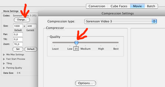 BTW, wie läst sich dies im Cubic Converter einstellen? In den Prefs finde ich keine Angaben zur QuickTime-Kompression, und im Programm selbst, naja, da ist nicht allzu viel zum Einstellen außer "Convert to QTVR". Hm. Wo suche ich nicht?Du schreibst leider nicht, welchen Kompressionsfaktor Du verwendest und welche resultierende Dateigröße Du erreichst.