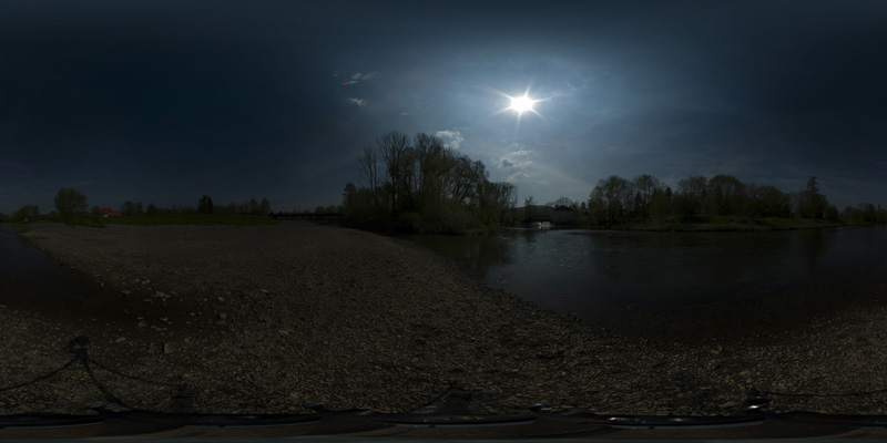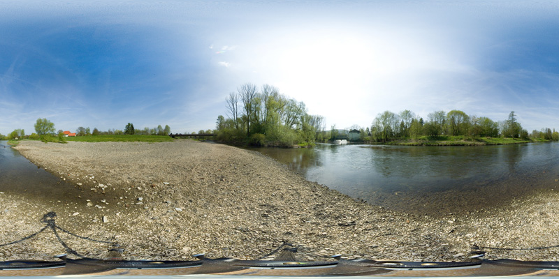 Die Bilder sind mit der Fuji S2 Pro und Sigma 10-20 mm "geschossen" (4 x 60Grad / 8 x 0 Grad / 4 x -60 Grad / Nadir) Im Moment arbeite ich noch mit JPEGs, da ich zum einen nicht sehr fit mit RAWs bin und auch den Zeitaufwand scheue. Habe aber auch da ein wenig versucht. Zunächst habe ich die Bilder im PTgui geladen und im Advanced Modus die nötigen Einstellungen vorgenommen. Danach habe ich alles durch die Automatik laufen lassen, Kontrollpunkte gelöscht, neue gesetzt (vertikal), immer wieder optimiert, so dass in meinen Augen das ergebniss passt. Das Ganze habe ich dann als PSD gespeichert (sollte ich da besser mit Tiff arbeiten?) und in Photoshop mit den Ebenen die letzten "Macken" beseitigt. Nach dem Erstellen des equirectangularen Bildes habe ich dieses in Pano2OTVR in Würfel konvertiert und in das Bodenbild (wiederum mit Hilfe von Photoshop-Ebenen) das Nadirbild eingearbeitet. Zum Schluss habe ich das Ganze dann in ein Quicktime-mov konvertiert.