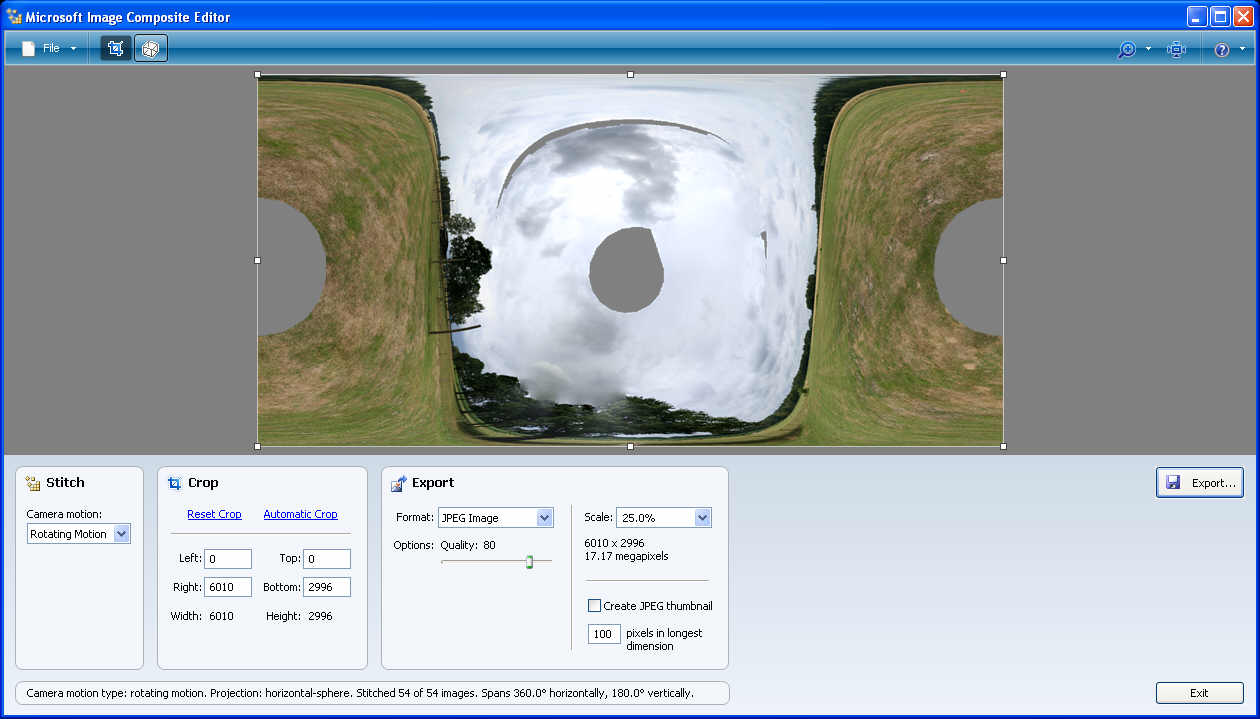 Today we are very pleased to announce the Microsoft Image Composite Editor. It is a free download available today from here. This application is the best image stitching tool that we have shipped to date. The stitching technology from the Interactive Visual Media Group has shipped previously in Windows Live Photo Gallery and more recently in Deep Zoom Composer. The core stitching engine in the Image Composite Editor uses the same advanced matching and blending techniques that I described in my Deep Zoom Composer blog entry. Beyond that this application adds the following features: