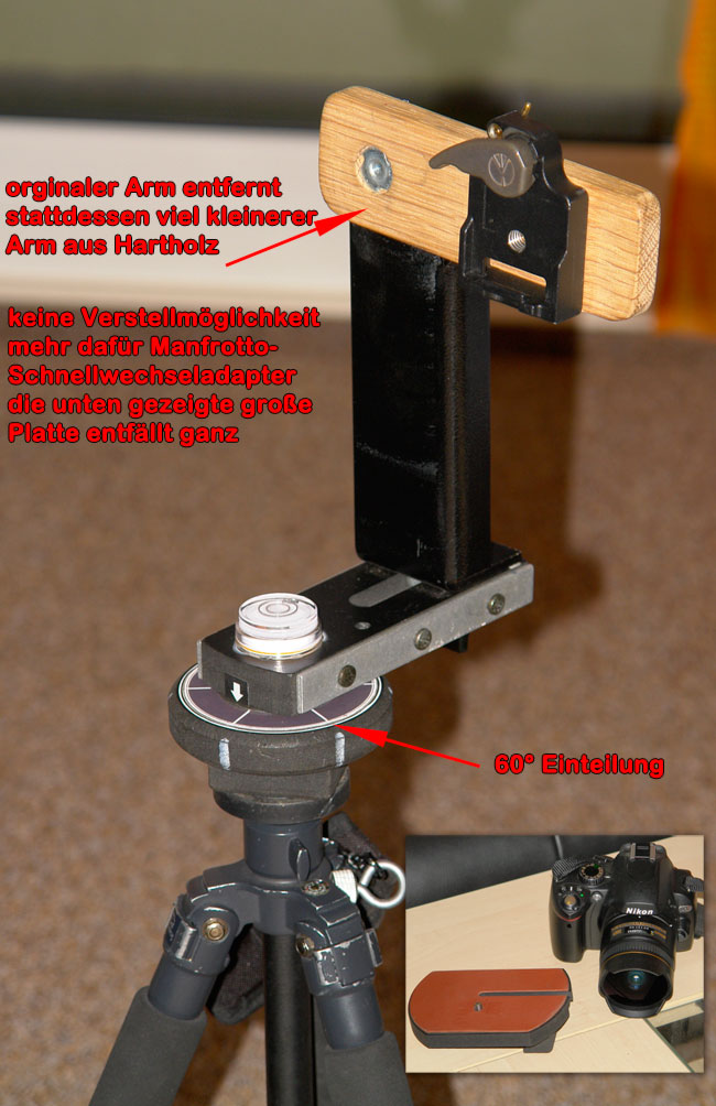 Gute Idee. So eine 60° (bzw. bei mir 36°) Einteilung könnte ich vielleicht noch hinbekommen, das Ersetzen des Originalarmes übersteigt wahrscheinlich meine handwerklichen Fähigkeiten . Da fällt aber wenigstens dieses ewige Gefummel beim Kamera hinschrauben weg.
