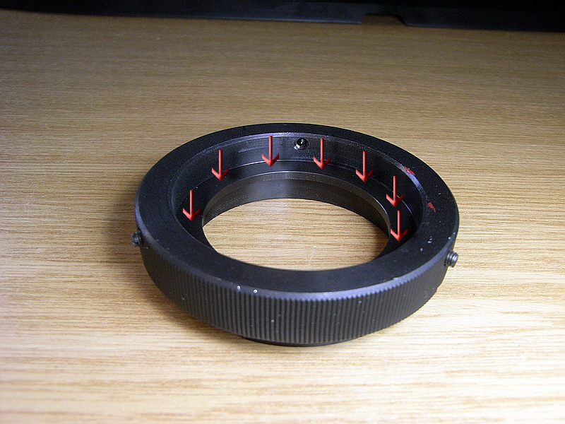 Im Übrigen hab ich mal den Canon-Adapter vom Peleng entfernt (3Klemmschrauben) und stelle fest daß seine Form keinerlei Auswirkung auf die Funktion des Scharfstellrings haben kann. Einzig die komplette Lage des Objektivs oder besser gesagt der Abstand des Objektivs zum Chip wird durch ein bestimmtes Maß des Adapters definiert.