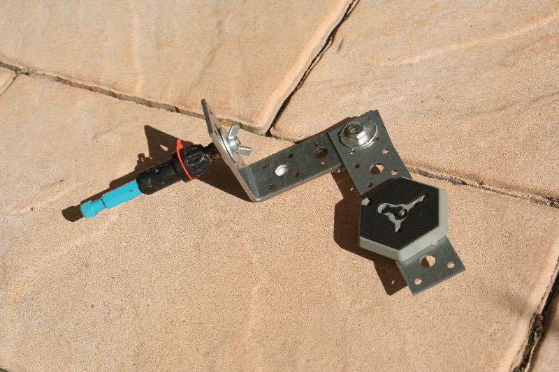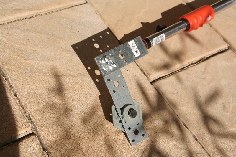 Für den Kopf einer Gardena-210-390-Stange habe ich mir ein passendes Gardena Gartenwerkzeug gekauft, den Stiel weggeflext und dort eine stinknormale M8-Schraube draufschweißen lassen. Das ganze wird in den Kopf der Stange gesteckt und mit der vorhandenen Schraube festgedreht. An der angeschweißten M8-Schraube wird ein Baumarktwinkel mit Langloch mit einer Flügelmutter befestigt – Wegen dem Langloch kann man den Winkel hin und herbewegen und so das Objektiv schön mittig in die Drehachse bringen.