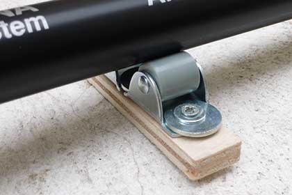Ich würde aus dem Eisenwarenladen / Skateboardladen ein paar Kugellager holen und die auf einer kleinen Platte so montieren, wie auf dem Bild die Rädchen.