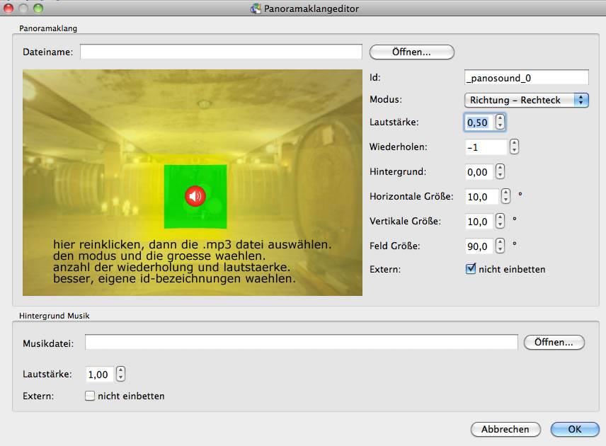 Im Hauptfenster steht: Klänge: 0 Klänge definiert. Klick auf "Ändern" ->Fenster: Panoramaklangeditor-> Panoramaklang ->Öffnen-> alles ausgegraut.