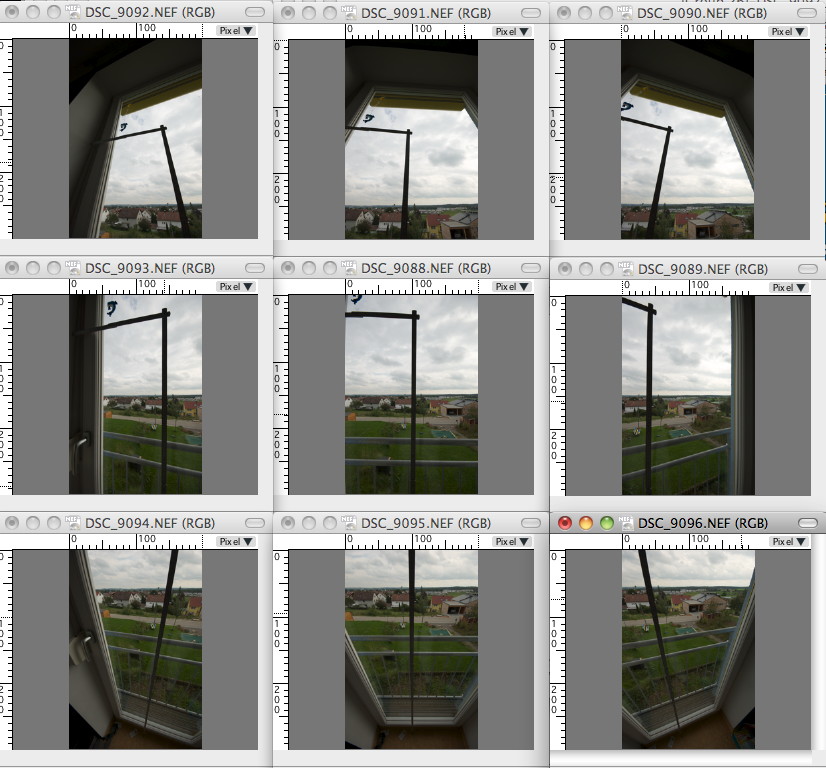 Dann justiert man den Nodalpunkt so genau, wie es möglich ist, in meinem Fall auf etwa 1mm genau, da ich von einem Einbeinstativ aus mehrreihige Kugelpanoramen mache. Ja, das geht! Das habe ich jetzt ausgiebig (stundenlang) gemessen und verifiziert.
