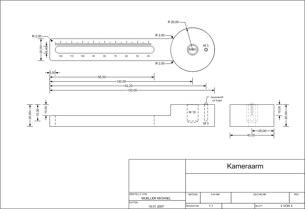 1. Winkelarm Die Auflagefläche für die Kamera würde ich breiter machen da wären für mich 20mm zu wenig. 2. Schraube Seitenteil mit Kameraarm Den Durchmesser 30 würde ich größer machen und nicht rund sonder mit einer griffigen Form versehen. 3. Seitenteil mit Kameraarm Ich würde diese Rasterung nicht dran machen. Das ist vieleicht bei 1,2 Panos toll aber auf Dauer ist eine simple Markierung schneller gemacht. 4. Wenn du zwischen Seitenteil und Kameraarm nur den Schraubedurchmesser als Zentrierung nimmst wäre ich nicht zufrieden. Du hast Spiel in der Bohrung und dem Gewinde. Denke daran das sind meine Anforderungen an einen Adapter das must du nicht übernehmen!