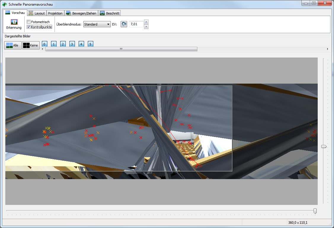 Kontrollpunkte, weshalb manuell nachgeholfen werden muss. Das Objektiv kann in PTGui kalibriert