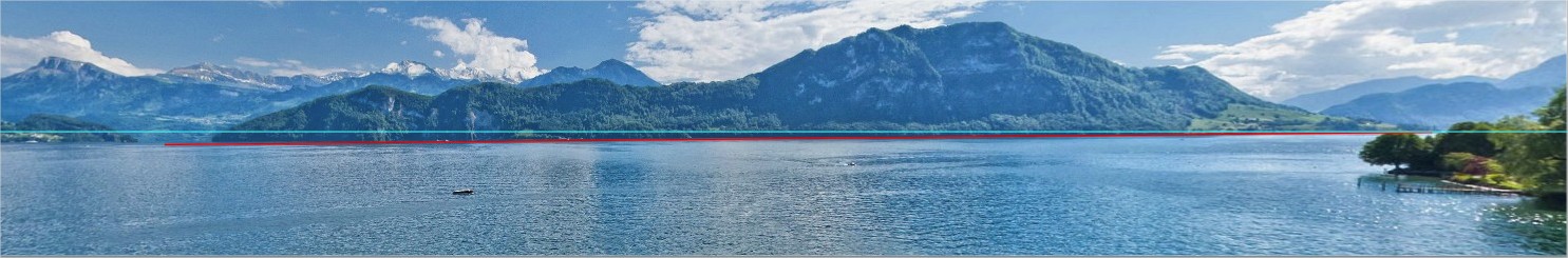 Ich glaube nicht das der Vierwaldstättersee so ein Gefälle hat. Blaue Linie ist dein Horizont, rote linie wäre Ideal.