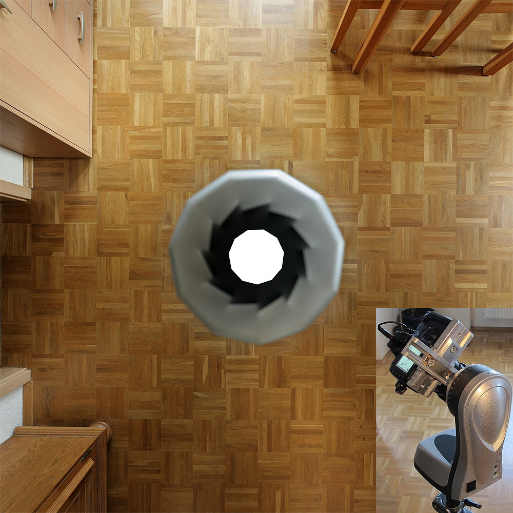 Erste Versuche: Einarbeitung ins Tablet (Linux und Softwarepakete, Papywizard...als Linux Neuling trotz kompetenter Unterstützung recht Zeitintensiv). Umfangreiche mechanische Modifizierungen damit sich Kamera und Objektiv a) wiederholgenau montieren lassen und b) im NP- und vor allem auch von Nadir bis Zenith schwenken lassen ( 01 02 ). In meinem Fall musste die Dosenlibelle samt ihrem Halter weg und die Batterieabdeckung bearbeitet werden ( klick ) . Funkauslöser und Bluetooth-Modul in den Kopf zu integrieren ist zwar nicht erforderlich, wollte ich aber so haben also weiterer Bastelaufwand. Nach einigen Versuchen mit dem ersten Programm stellte ich merkwüdiges Fahrverhalten fest. Ein Firmwareupdate war erforderlich. Weitere Einarbeitung bis das passte. Nach den ersten Vollkugeln fiel schnell auf daß ein relativ großer Bereich vom Boden durch den Merlin verdeckt wird (siehe hier und hier 1 Parkettfeld hat übrigens16cm!). Das erfordert bei Vollkugeln schon einiges an Nadirretusche.