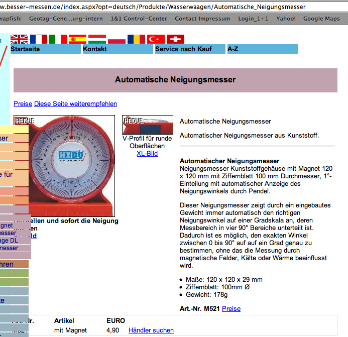 Theoretisch müssten 2 Winkelmessungen auch mit einer iPhone App gehen, um die waagrechte und senkrechte Achse auszurichten. Da ich nur einen iPod touch mit den abgerundeten Ecken habe, habe ich so eine Messug noch nicht mit der der Wasserwaagen verglichen. Lass mir mal 1 Eisenwinkel abkanten...