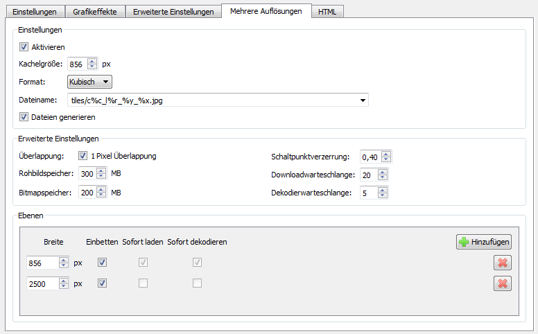 Im Punkt "Mehrere Auflösungen" in Pano2VR kann man die Kachelgröße einstellen. Muss diese genau so groß sein, wie die Würfelkantenlänge der kleineren Ansicht?