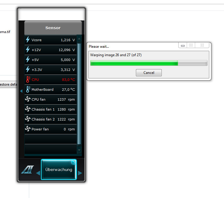 Sobald ich anfange bspw. mit PTGui zu stitchen oder per Batch eine Belichtungsreihe mit Photomatix zu bearbeiten, erhitzt sich die CPU sehr stark (siehe Anhang) und der CPU-Lüfter dreht wie verrückt. Nach Fertigstellung pendelt sich die Temperatur innerhalb weniger Sekunden auf ~30° C wieder ein.