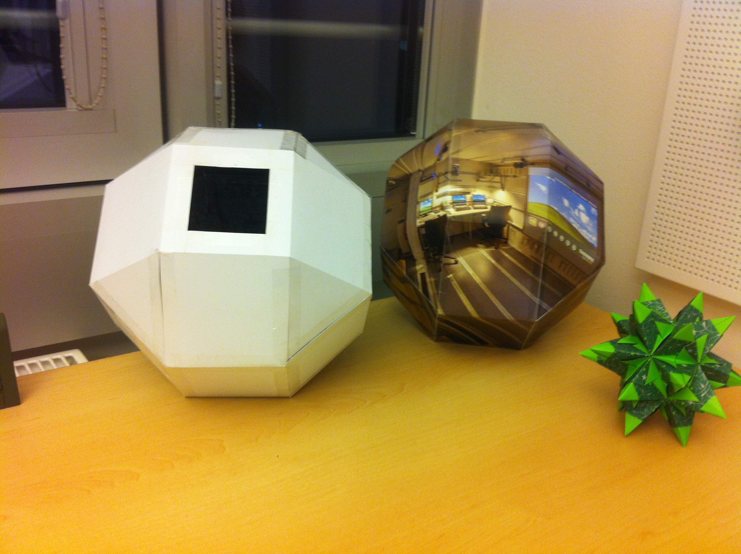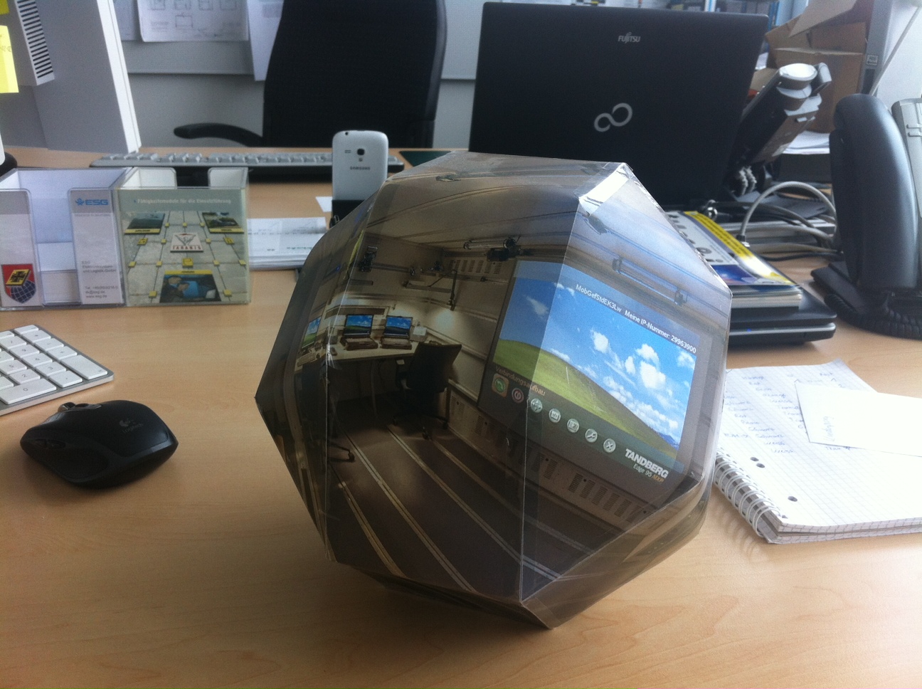 Seit zwei Jahren liegt auf meinem Schreibtisch eine gebastelte Philosphere, also ein von PtGui ausgegebenes 3D-Körperchen, der nur noch asgeschnitten und zusammengeklebt werden musste. Durch Zufall hat davon unser Marketing Wind bekommen, und ich habe eine neue Sphere gebaut, bei welcher das Panorama nicht ausen zu sehen ist sondern innen. Zuerst war der räumliche EIndruck nicht ganz optimal, weil der FOV im Aussenbereich in echt zum Betrachter hingewölbt ist, und bei der Kugel mit Aussendruck nicht. Aber jetzt (weiße Sphere), mit ausreichender Beleuchtung von außen, ist das ein richtig cooler Eindruck.