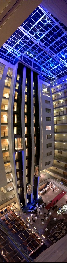 Ich hatte dort leider nie SLR Ausrüstung dabei. Habe mal vom Stockwerk meines Zimmers (relativ weit oben) mit dem Handy ein vertikales Panorama gemacht, aber das kann man natürlich vergessen. Aber finde es architektonisch eines der schönsten Hotel in Deutschland. Tolle Atmosphäre kommt dort auf und die angeschlossene Bar "Gekkos" ist nicht zu verachten.Komisch, neulich hatte ich da ein Treffen und dachte noch, es würde sich lohnen, dort ein Panorama zu machen.