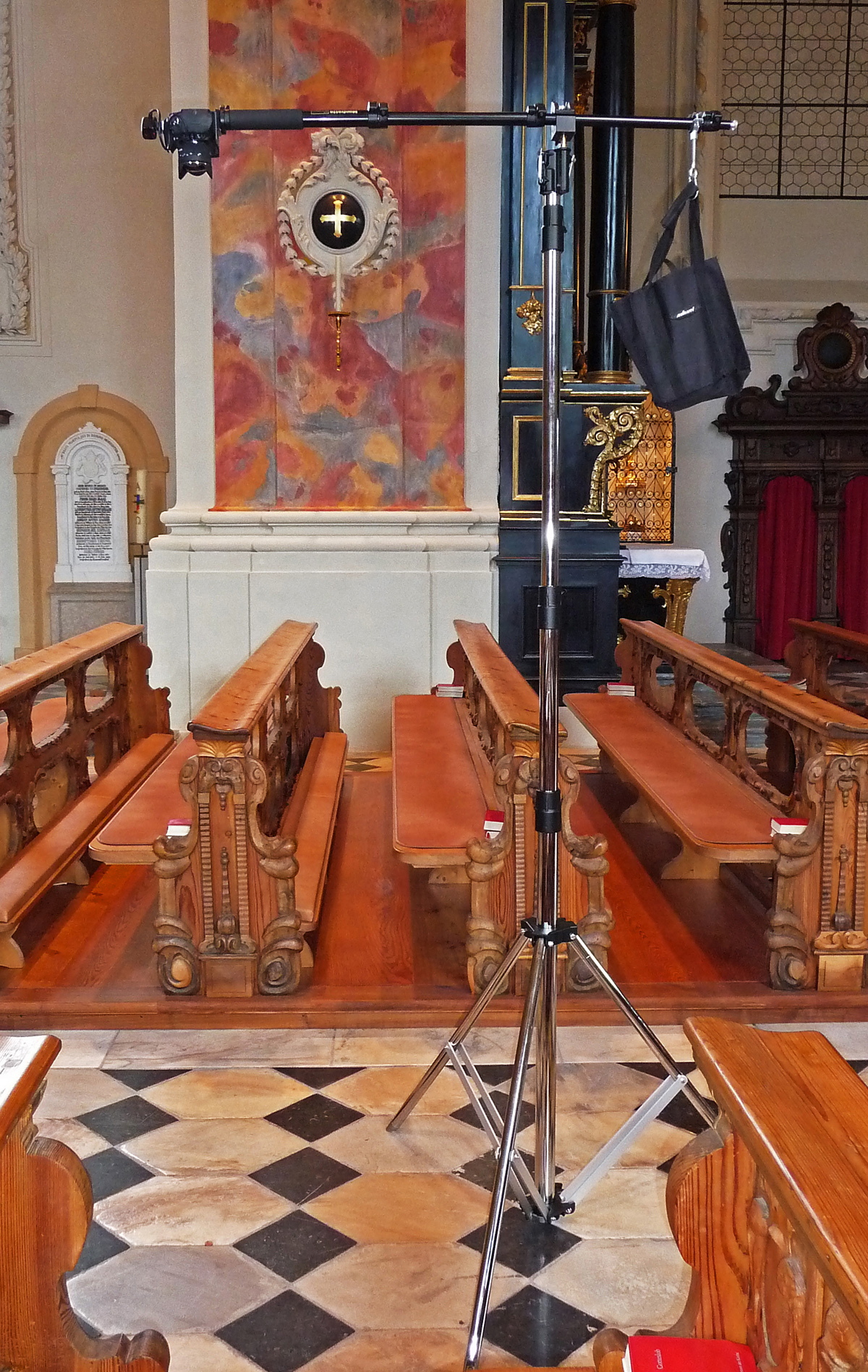 Bei Kirchen und Kapellen mache ich immer ein Bodenbild (auch HDR) - siehe Anhang. Manfrotto Klammer - 1 Pole - und eine Tasche mit Sand als Gegengewicht.