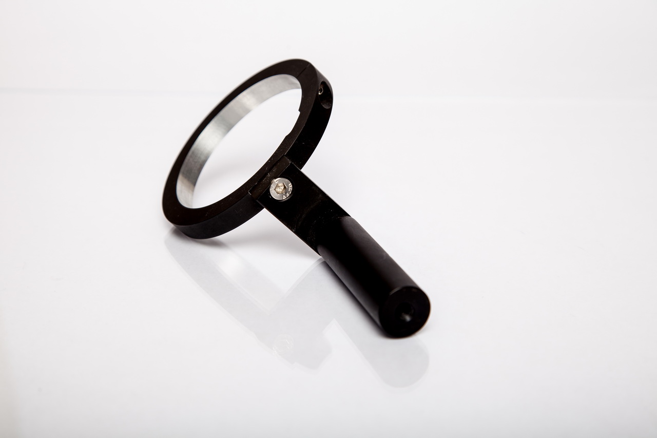 Oben im Ring ist eine kleine Dosenlibelle zur leichten Ausrichtung eingelassen. Der aus Aluminium gefräste Ring ist wie auch die zylindrische Verlängerung, eloxiert.