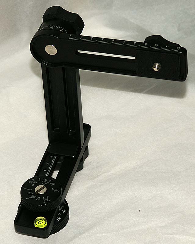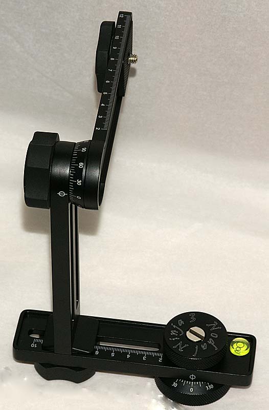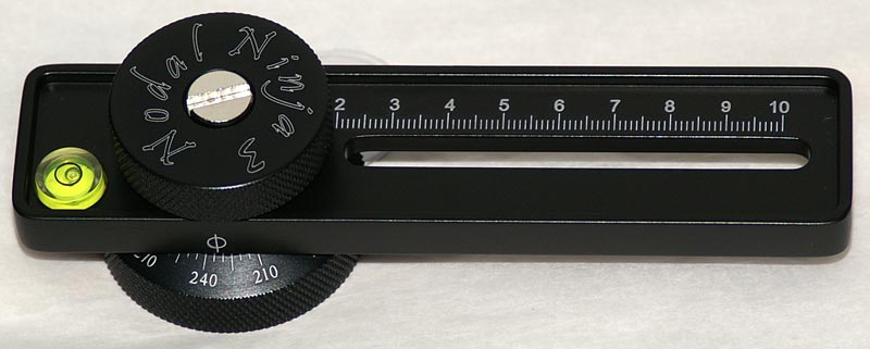 Panoramakopf für die "Immer-Dabei-Ausrüstung". Er ist klein (zusammengelegt ca. 18cm x 5cm x 5cm) und leicht (knapp 500 Gramm) aber trotzdem stabil (vollständig aus Aluminium gefertigt). Er besitzt einen Klickstop-Mechanismus in der unteren Drehvorrichtung mit im Set enthaltenen Scheiben für folgende Abstufungen: 15, 18, 20, 24, 45, 60, 72, 90, 120 Grad. Ebenso im Set enthalten ist eine Kameraplatte (kann an der Kamera verbleiben). Alle Schlitten und Drehachsen sind mit Skalen versehen.